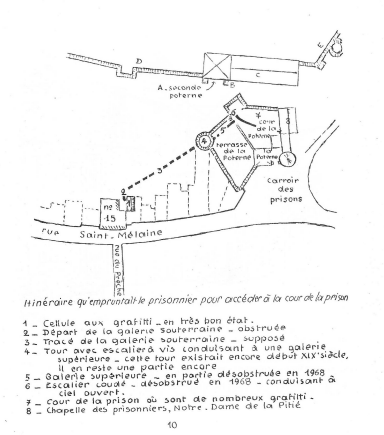Cette maison très riante rue Saint-Mélaine, possédant dans sa façade une jolie fenêtre à meneau surmontée de corbeaux du XVIème siècle, ne laisse pas supposer qu’elle cache dans sa cour, de sombres cellules de prisonniers.